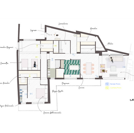 Il progetto propone una nuova visione dell’abitare in mansarda: uno spazio funzionale, elegante e ricco di carattere, dove ogni scelta progettuale è al servizio della qualità dell’ambiente e della vita quotidiana. La configurazione interna si articola a partire da un ingresso che immette nella zona giorno open space, dove trovano posto il soggiorno e la cucina con isola. L’intera area è caratterizzata da un’atmosfera luminosa e accogliente, grazie alla presenza di una grande porta finestra che si apre sul terrazzo, garantendo un costante apporto di luce naturale e una relazione diretta con l’esterno. Elemento distintivo dello spazio living è la presenza di una cantina su misura, incassata nella zona più bassa del sottotetto. Progettata appositamente per sfruttare un’area altrimenti di difficile utilizzo, la cantina è pensata come vetrina funzionale ed espositiva per la conservazione dei vini, con struttura integrata nel disegno dell’arredo e illuminazione dedicata. La cucina, organizzata attorno a un’isola centrale, si distingue per la pavimentazione in piastrelle di ceramica decorata a mano con motivo geometrico bianco e nero, in contrasto con il parquet in rovere naturale posato a spina italiana, che riveste uniformemente il resto dell’abitazione e accompagna il movimento delle falde di copertura. La struttura portante dell’ambiente è lasciata a vista: i pilastri in cemento grezzo scandiscono lo spazio e costituiscono un elemento di carattere, in dialogo con le superfici naturali e le finiture artigianali. La matericità del cemento contribuisce a definire un linguaggio architettonico autentico e contemporaneo. La separazione tra l’ingresso/zona notte e il soggiorno è definita da una parete attrezzata forata, realizzata su misura con elementi modulari in terracotta. Questa schermatura filtra la luce e suggerisce una soglia visiva senza interrompere la continuità spaziale, svolgendo al tempo stesso una funzione contenitiva e compositiva. La selezione dei materiali – rovere, ceramica decorata, cemento grezzo e terracotta – segue una logica di coerenza estetica e materica, costruendo un ambiente domestico contemporaneo ma fortemente radicato nel contesto mediterraneo.